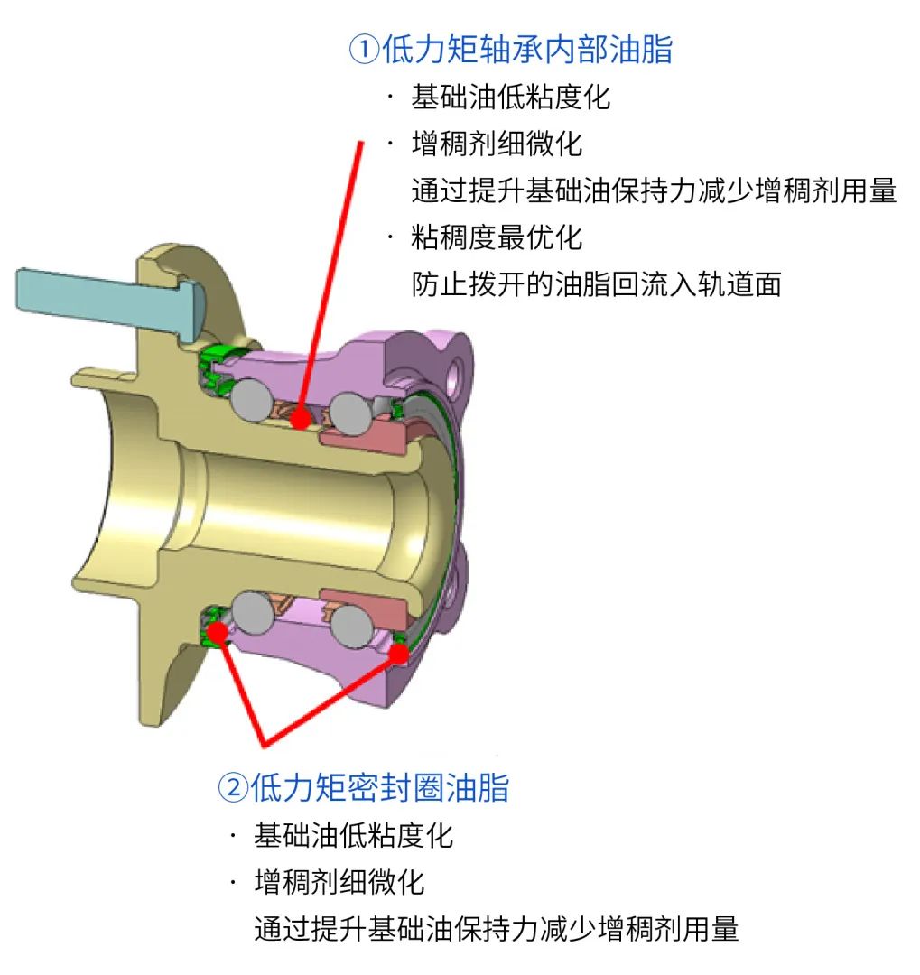 通過(guò)增稠劑尺寸的微細(xì)化,在不降低基礎(chǔ)油的保持力的情況下成功地削減了增稠劑量,進(jìn)一步實(shí)現(xiàn)了潤(rùn)滑脂的低粘度化。這些改進(jìn)減少了密封圈旋轉(zhuǎn)時(shí)由油脂引起的阻力,并降低了行駛時(shí)的旋轉(zhuǎn)摩擦力矩。