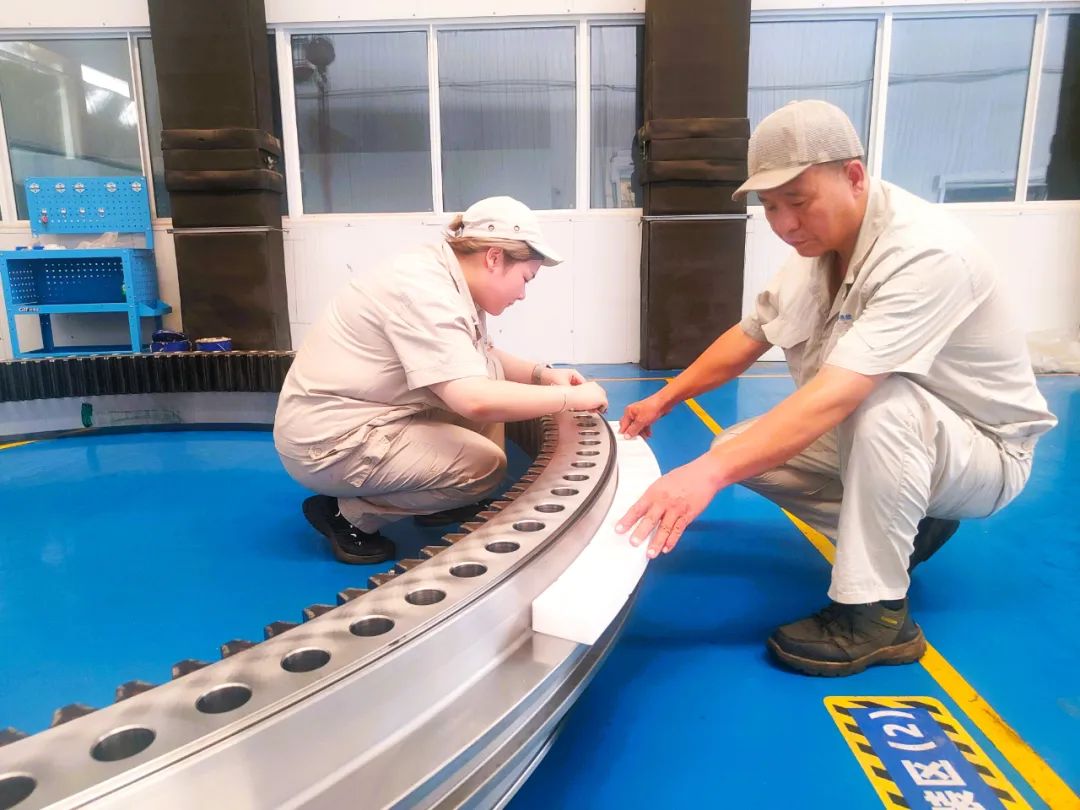 此次,洛軸為其批量配套的產(chǎn)品主要應(yīng)用于風(fēng)機(jī)的偏航、變槳兩個(gè)部位,其產(chǎn)品外徑尺寸最大達(dá)到5.6m,單重超過13噸。為確保產(chǎn)品順利研發(fā),洛軸研發(fā)生產(chǎn)團(tuán)隊(duì),針對(duì)產(chǎn)品使用工況特殊要求,結(jié)合前期積累的研發(fā)制造經(jīng)驗(yàn),運(yùn)用新工藝、新技術(shù),確保產(chǎn)品順利加工。尤其是針對(duì)變槳軸承淬火工藝要求高,內(nèi)圈徑向滾道為凹槽型,加工難度大等問題,運(yùn)用獨(dú)創(chuàng)加工方法,反復(fù)試驗(yàn),不斷攻堅(jiān),最終滿足徑向滾道淬硬層符合要求,還兼顧提升了軸向滾道淬火后與擋邊交界處質(zhì)量。同時(shí),加工過程中,洛軸還對(duì)徑向滾道直線性及粗糙度等進(jìn)行了嚴(yán)格的質(zhì)量管控,確保了產(chǎn)品裝配一次合套成功。