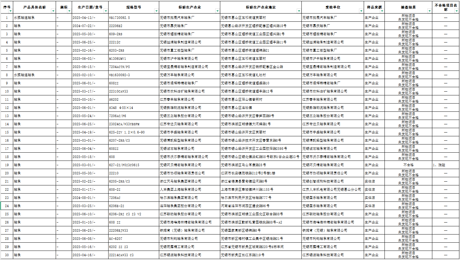 2025年度,無錫市市場監(jiān)督管理局對軸承產品質量進行了監(jiān)督抽查。共抽查產品30批次,不合格產品1批次,不合格發(fā)現(xiàn)率為3.3%。
