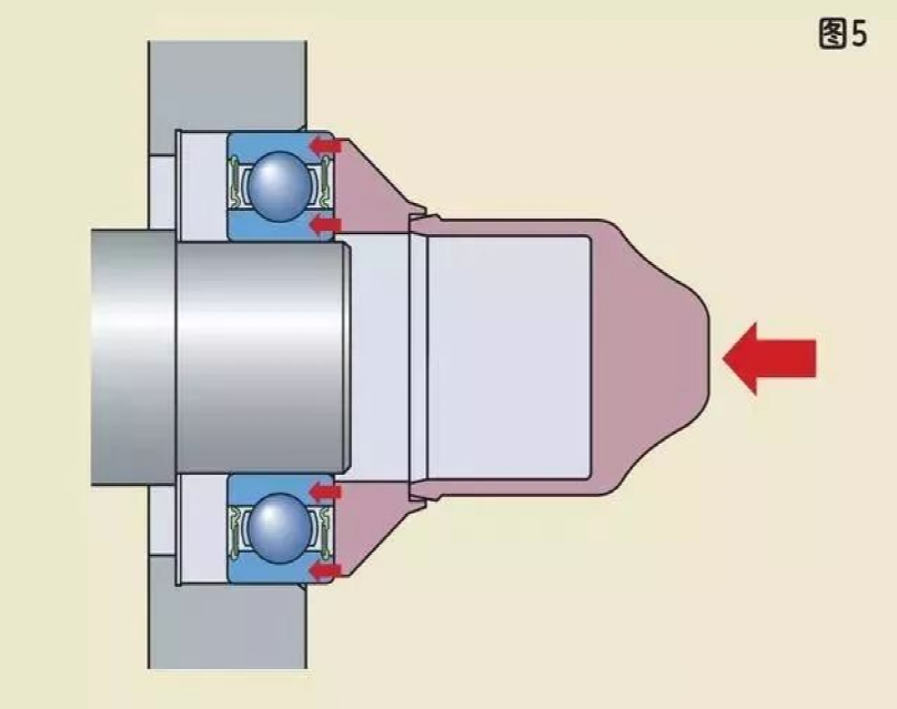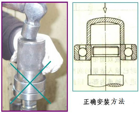 安裝內(nèi)圈(或外圈)過(guò)盈配合的軸承,禁止用鐵錘直接敲擊軸承內(nèi)圈(或外圈)端面,這樣很容易把擋邊敲壞。應(yīng)該采用套筒放在內(nèi)圈(或外圈)端面上,用鐵錘敲擊套筒來(lái)安裝。