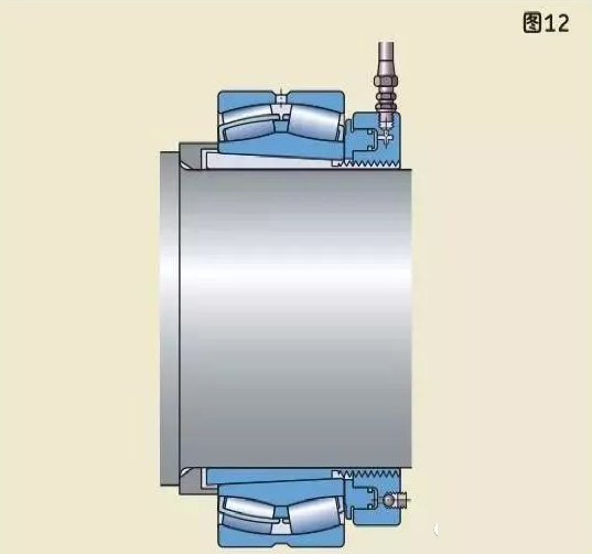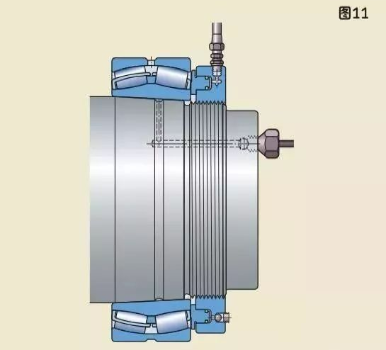 較大軸承需要更大的力來(lái)安裝,因此應(yīng)使用液壓螺母。液壓螺母可以把圓錐孔軸承安裝在圓錐形軸徑上(圖11),緊定套上(圖12),退卸套上(圖13)。