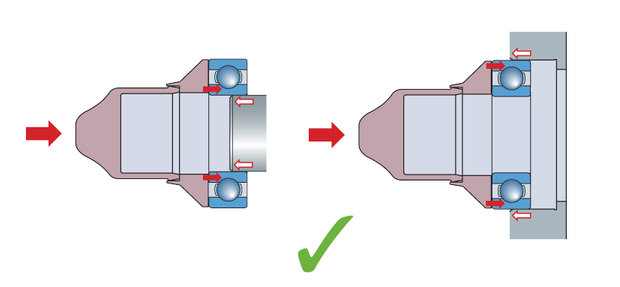 安裝內(nèi)圈過(guò)盈配合的軸承時(shí),不能通過(guò)外圈和滾動(dòng)體把力傳遞給內(nèi)圈。這會(huì)把軸承滾道和滾動(dòng)體表面敲壞,使軸承在運(yùn)轉(zhuǎn)時(shí)產(chǎn)生噪音并提前損壞。正確的方法應(yīng)該用套筒直接把力作用在內(nèi)圈端面上。