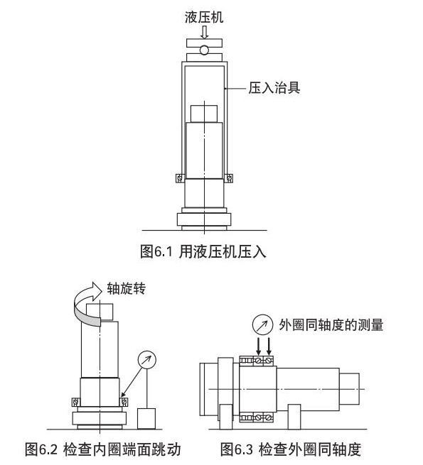然后,在壓入內(nèi)圈時(shí),應(yīng)使用內(nèi)圈壓入工具,確實(shí)將其壓入軸肩(請(qǐng)勿向外圈加力)。壓入后,測(cè)量軸承各部位的精度,確認(rèn)是否確實(shí)安裝在軸上。另外,組配使用多列軸承時(shí),在組裝后應(yīng)測(cè)量其跳動(dòng),修正外圈間的軸心偏差。